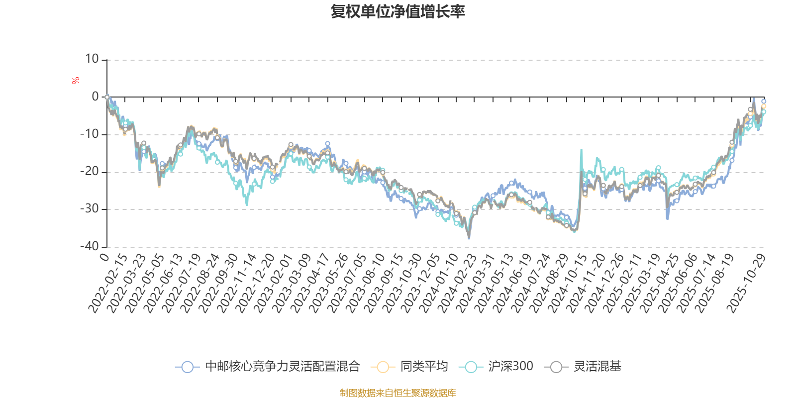截至10月29日,中邮核心竞争力灵活配置混合近三个月复权单位净值增长率为25.54%,位于同类可比基金251/1287;近半年复权单位净值增长率为36.06%,位于同类可比基金386/1287;近一年复权单位净值增长率为29.82%,位于同类可比基金495/1287;近三年复权单位净值增长率为26.02%,位于同类可比基金464/1286。