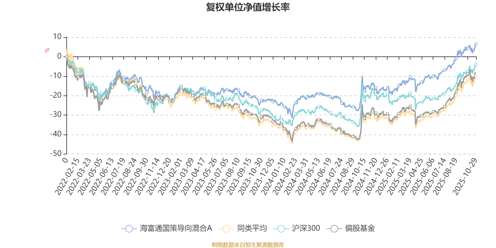 截至10月29日,海富通国策导向混合A近三个月复权单位净值增长率为11.28%,位于同类可比基金179/265;近半年复权单位净值增长率为23.37%,位于同类可比基金186/265;近一年复权单位净值增长率为26.29%,位于同类可比基金162/265;近三年复权单位净值增长率为34.15%,位于同类可比基金81/253。