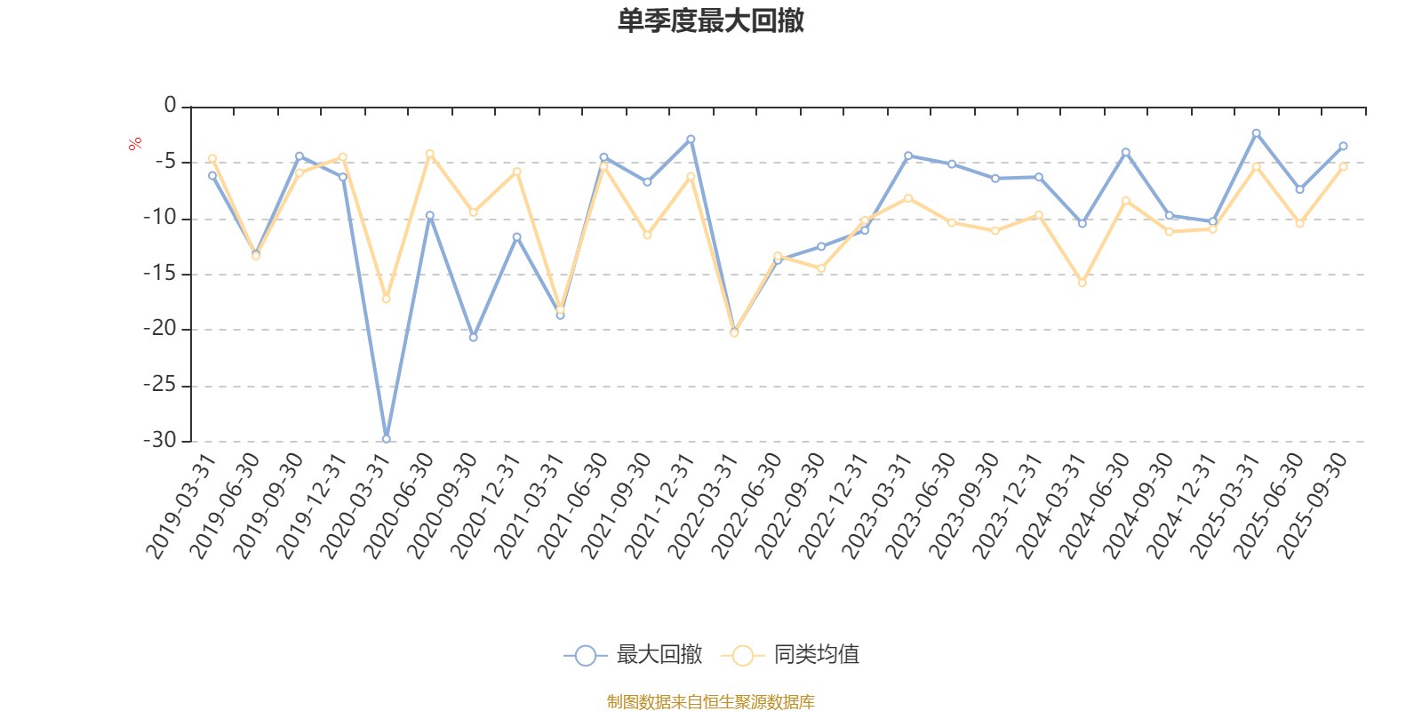 截至10月29日,基金近三年最大回撤为18.79%,同类可比基金排名13/251。单季度最大回撤出现在2020年一季度,为29.79%。