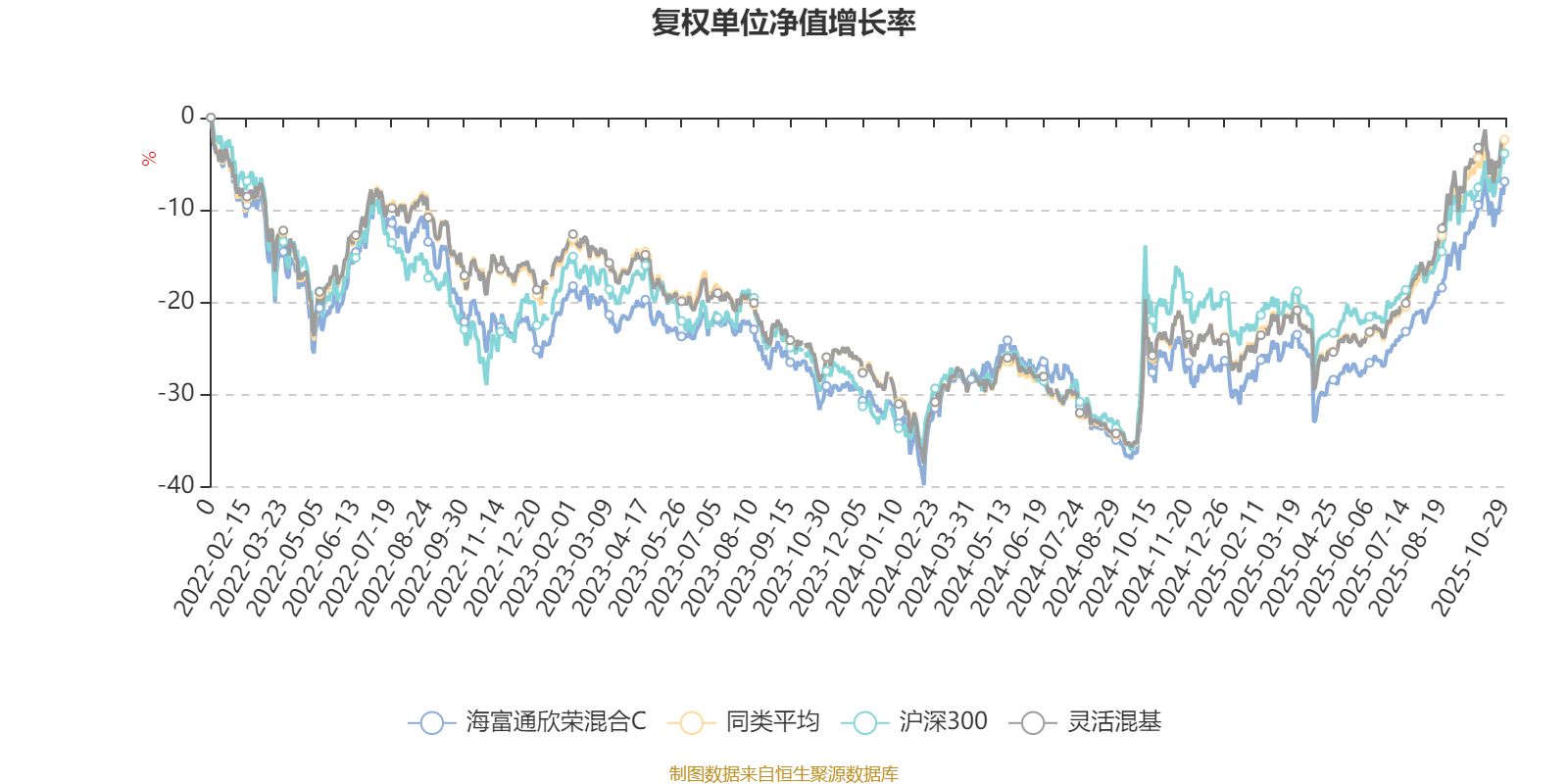 截至10月29日,海富通欣荣混合C近三个月复权单位净值增长率为17.65%,位于同类可比基金440/1287;近半年复权单位净值增长率为30.66%,位于同类可比基金486/1287;近一年复权单位净值增长率为26.29%,位于同类可比基金584/1287;近三年复权单位净值增长率为23.84%,位于同类可比基金514/1286。