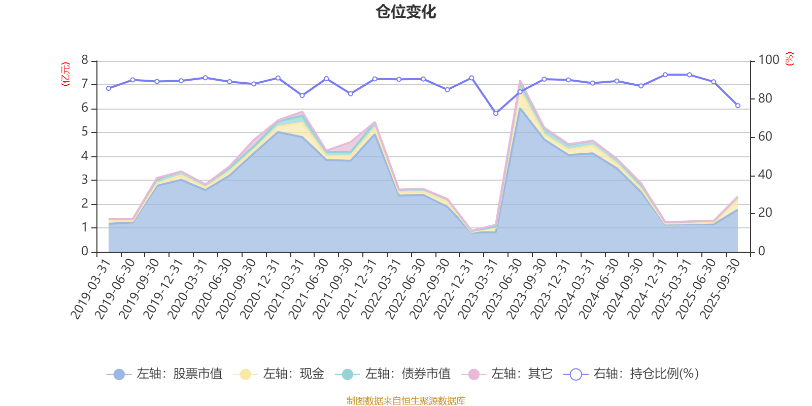 据定期报告数据统计,近三年平均股票仓位为86.99%,同类平均为72.35%。2024年末基金达到92.76%的最高仓位,2023年一季度末最低,为72.57%。
