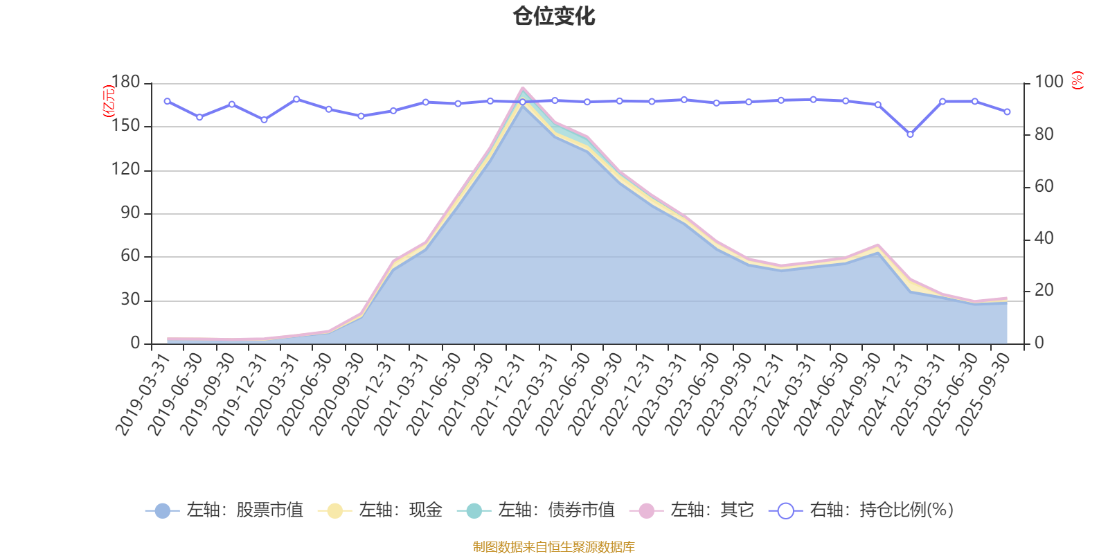 据定期报告数据统计,近三年平均股票仓位为91.59%,同类平均为72.35%。2020年一季度末基金达到93.84%的最高仓位,2024年末最低,为80.34%。
