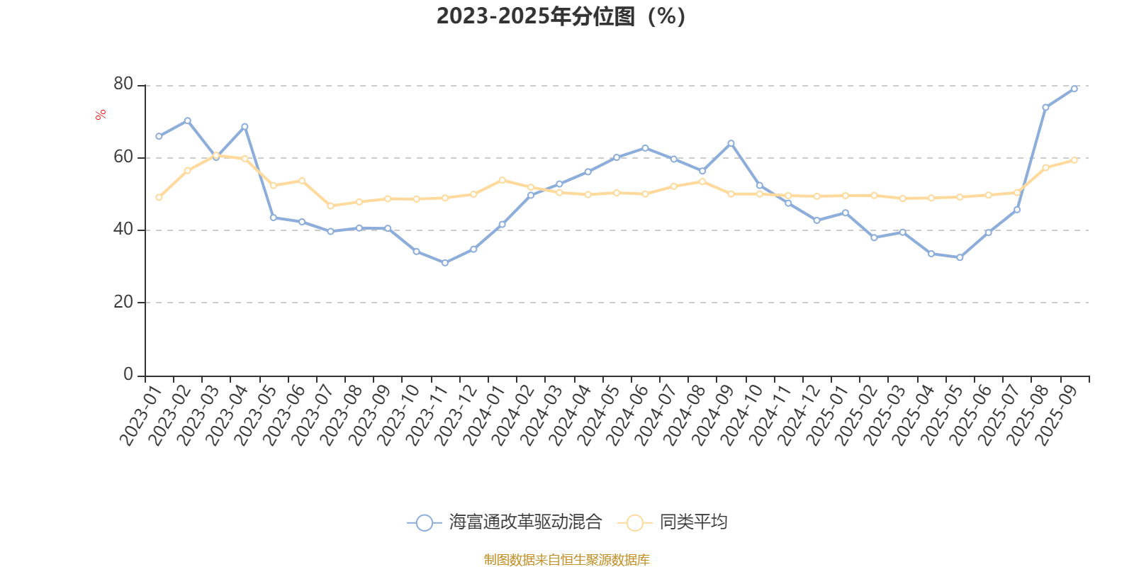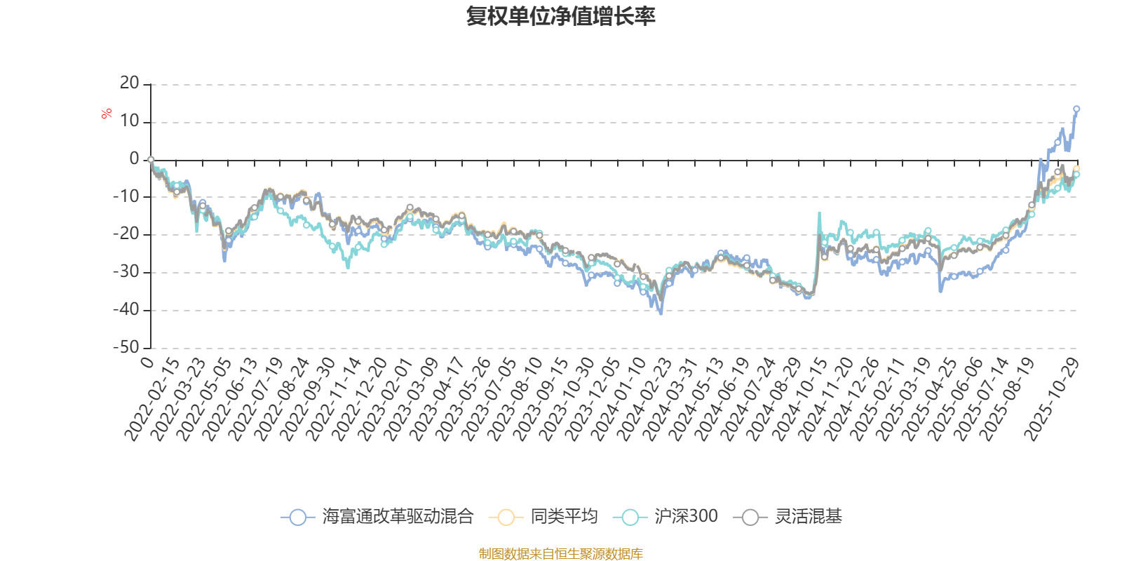 截至10月29日,海富通改革驱动混合近三个月复权单位净值增长率为39.70%,位于同类可比基金83/1287;近半年复权单位净值增长率为65.14%,位于同类可比基金91/1287;近一年复权单位净值增长率为50.16%,位于同类可比基金183/1287;近三年复权单位净值增长率为44.59%,位于同类可比基金209/1286。