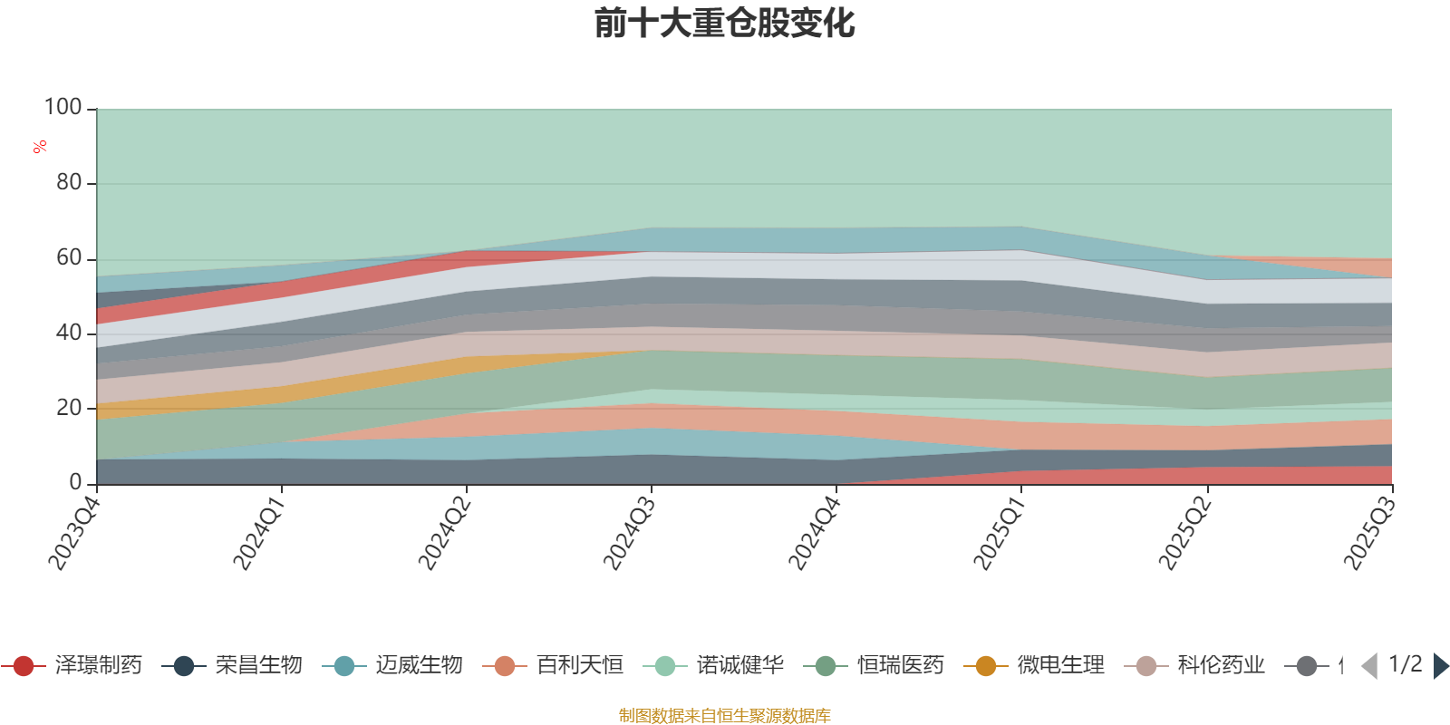 该基金持股集中度较高,且持股标的较为稳定。截至2025年三季度末,基金十大重仓股分别是恒瑞医药、科伦药业、百利天恒、百济神州、新诺威、荣昌生物、三生国健、泽璟制药、诺诚健华、信立泰。