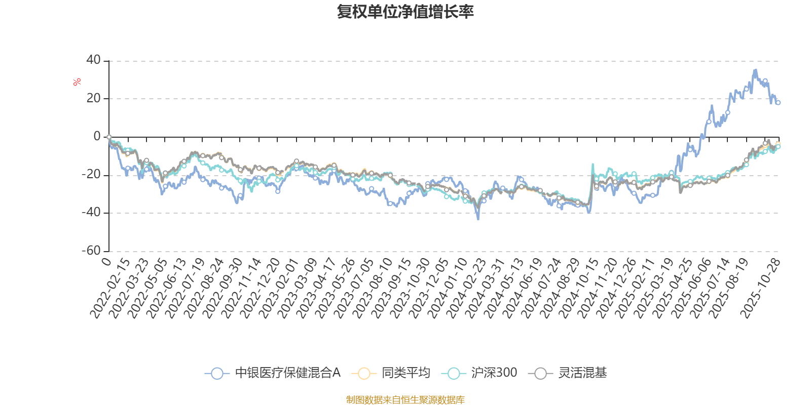 截至10月28日,中银医疗保健混合A近三个月复权单位净值增长率为-3.23%,位于同类可比基金1256/1287;近半年复权单位净值增长率为25.28%,位于同类可比基金605/1287;近一年复权单位净值增长率为58.46%,位于同类可比基金98/1287;近三年复权单位净值增长率为55.83%,位于同类可比基金121/1286。