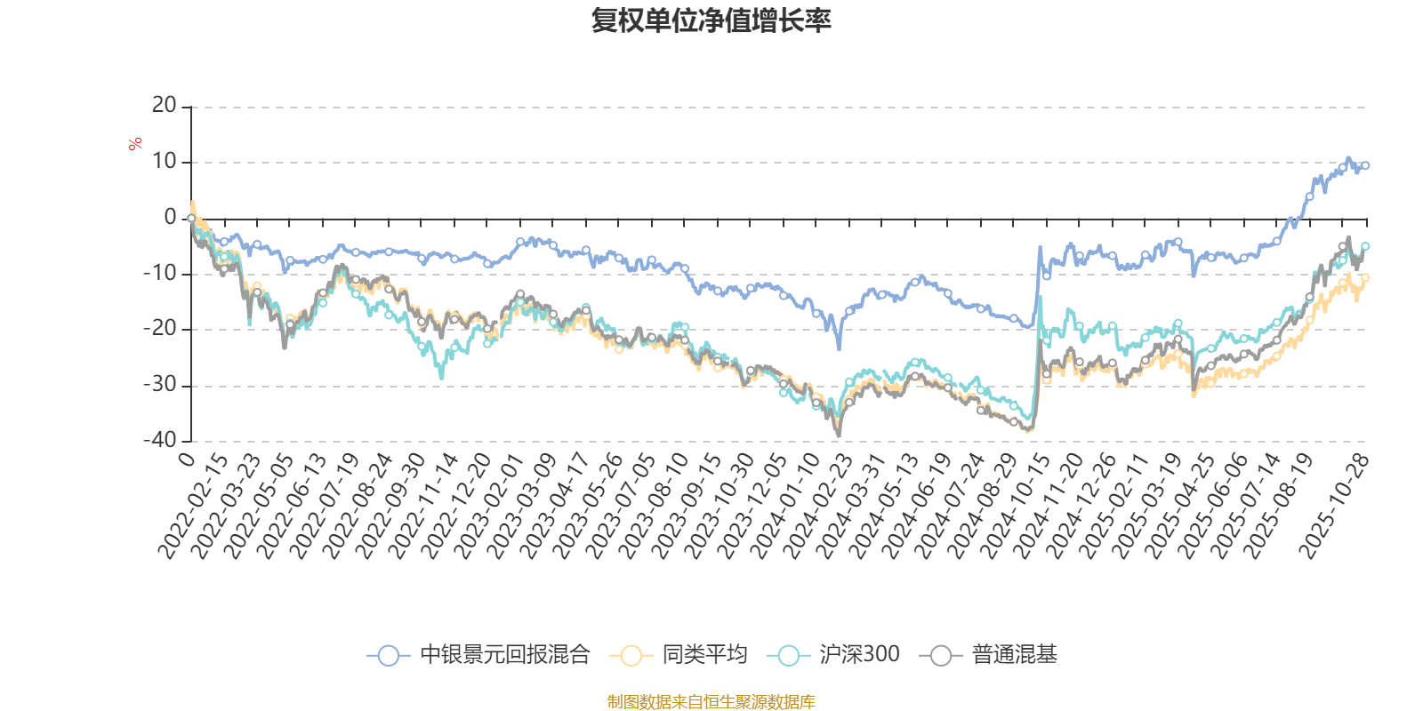 截至10月28日,中银景元回报混合近三个月复权单位净值增长率为9.72%,位于同类可比基金71/134;近半年复权单位净值增长率为18.27%,位于同类可比基金75/134;近一年复权单位净值增长率为18.31%,位于同类可比基金65/130;近三年复权单位净值增长率为17.72%,位于同类可比基金66/119。