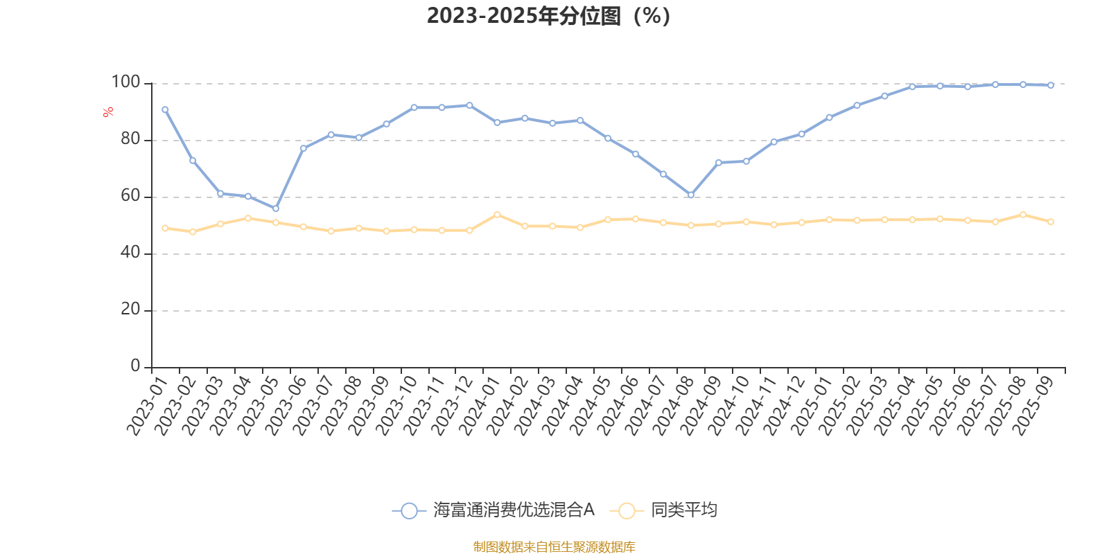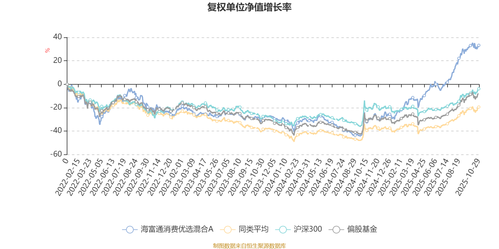 截至10月29日,海富通消费优选混合A近三个月复权单位净值增长率为21.64%,位于同类可比基金168/689;近半年复权单位净值增长率为45.45%,位于同类可比基金119/688;近一年复权单位净值增长率为89.06%,位于同类可比基金13/657;近三年复权单位净值增长率为77.15%,位于同类可比基金15/364。