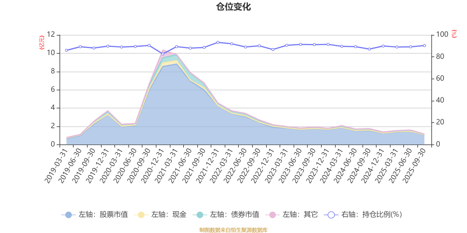 据定期报告数据统计,近三年平均股票仓位为89.64%,同类平均为87.15%。2021年末基金达到93.24%的最高仓位,2020年末最低,为82.7%。