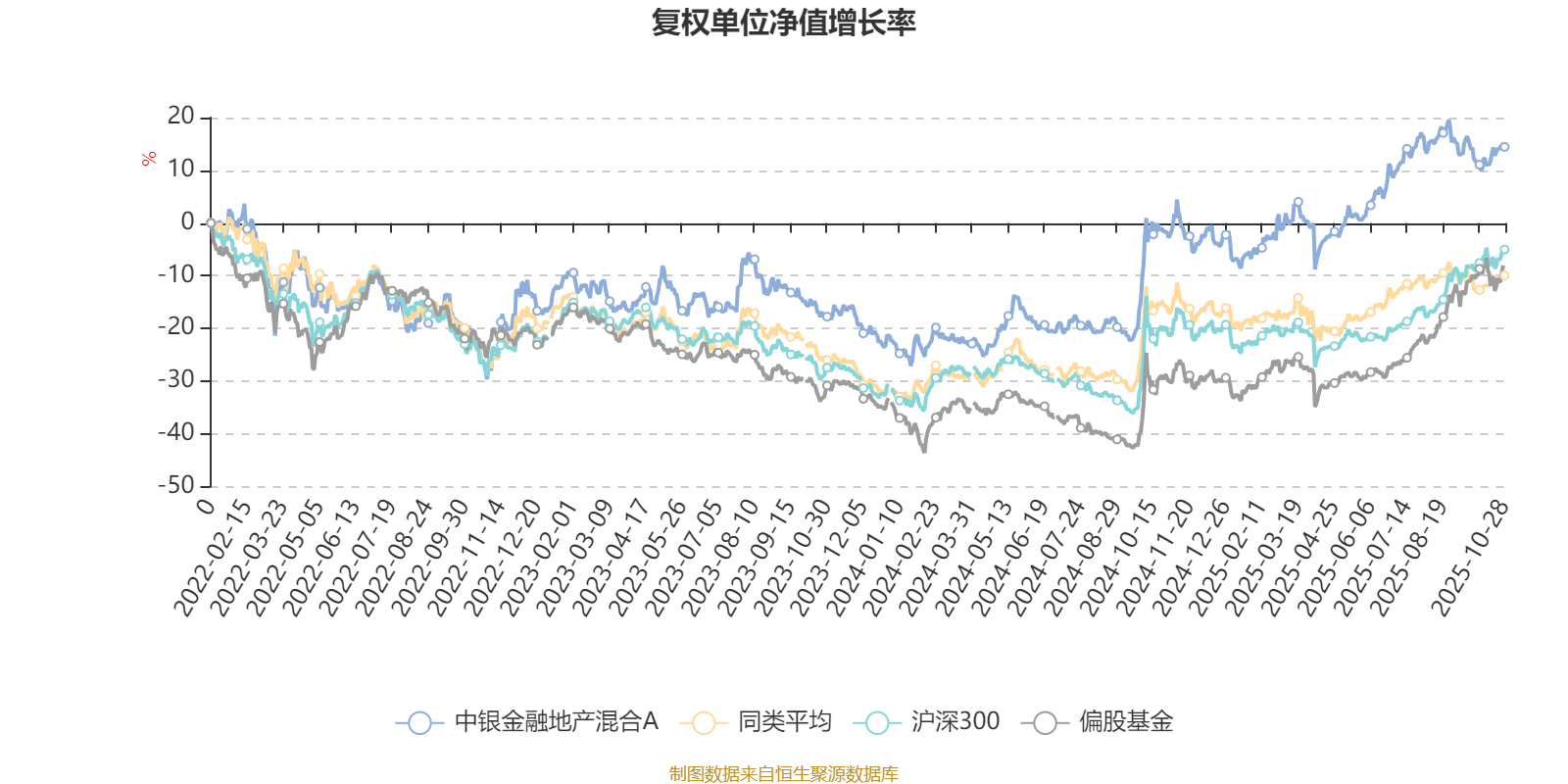 截至10月28日,中银金融地产混合A近三个月复权单位净值增长率为-2.29%,位于同类可比基金12/16;近半年复权单位净值增长率为16.74%,位于同类可比基金5/16;近一年复权单位净值增长率为16.35%,位于同类可比基金3/14;近三年复权单位净值增长率为58.95%,位于同类可比基金2/12。