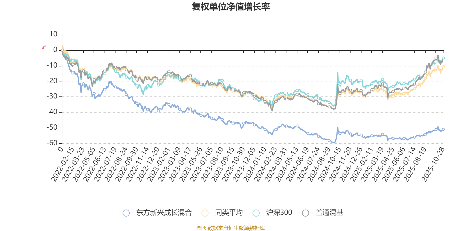截至10月28日,东方新兴成长混合近三个月复权单位净值增长率为9.07%,位于同类可比基金76/134;近半年复权单位净值增长率为14.47%,位于同类可比基金86/134;近一年复权单位净值增长率为3.62%,位于同类可比基金121/130;近三年复权单位净值增长率为-19.82%,位于同类可比基金117/119。