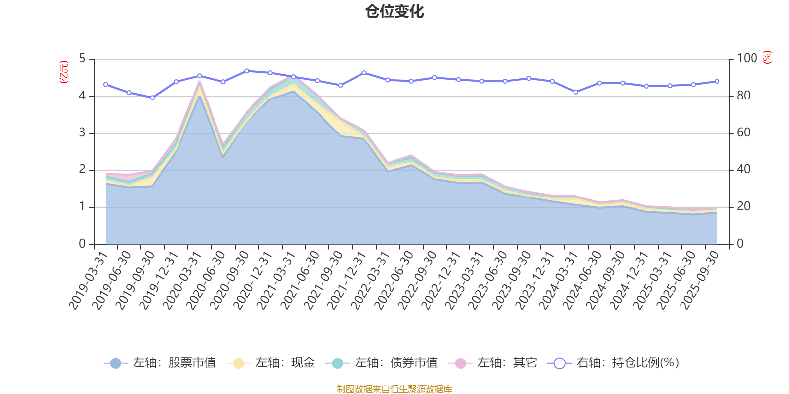 据定期报告数据统计,近三年平均股票仓位为87.02%,同类平均为67.37%。2020年三季度末基金达到93.53%的最高仓位,2019年三季度末最低,为79.21%。