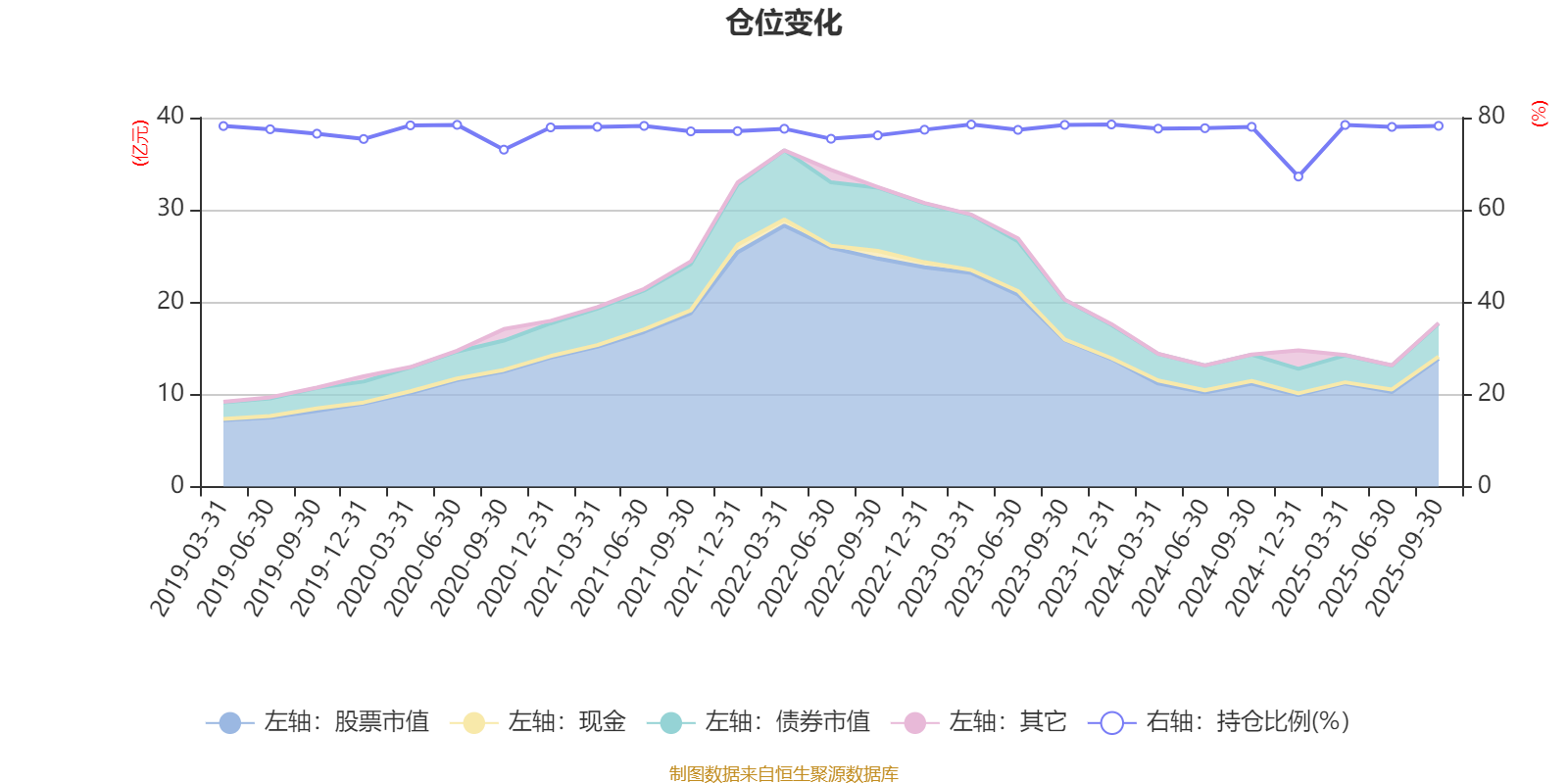 据定期报告数据统计,近三年平均股票仓位为77.1%,同类平均为67.37%。2023年末基金达到78.51%的最高仓位,2024年末最低,为67.22%。