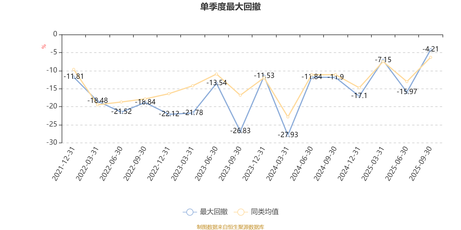 截至10月29日,基金近三年最大回撤为60.86%,同类可比基金排名57/61。单季度最大回撤出现在2024年一季度,为27.93%。