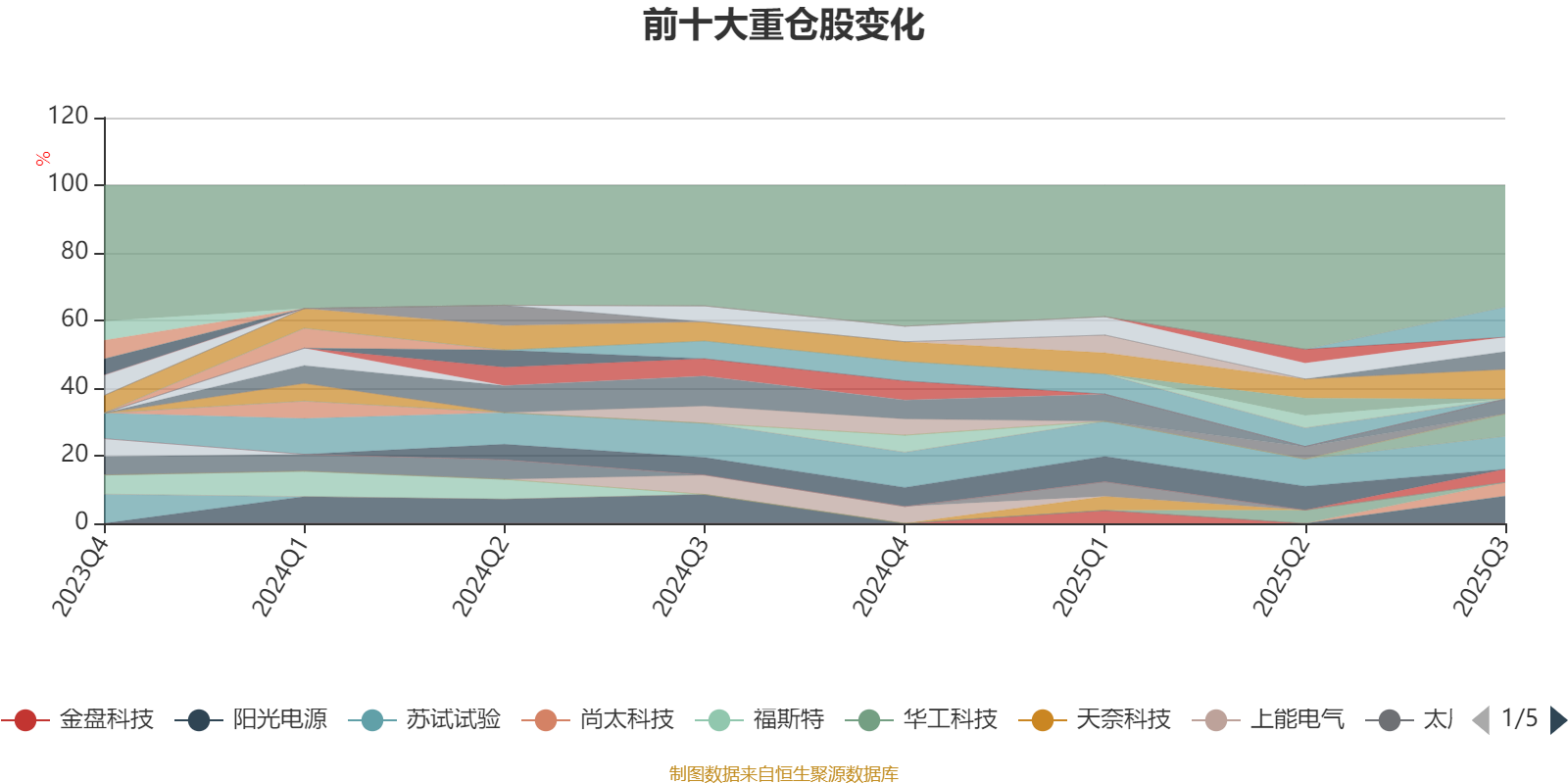 该基金持股集中度较高。截至2025年三季度末,基金十大重仓股分别是宁德时代、华友钴业、亿纬锂能、阳光电源、通威股份、盛弘股份、德业股份、爱旭股份、尚太科技、富临精工。
