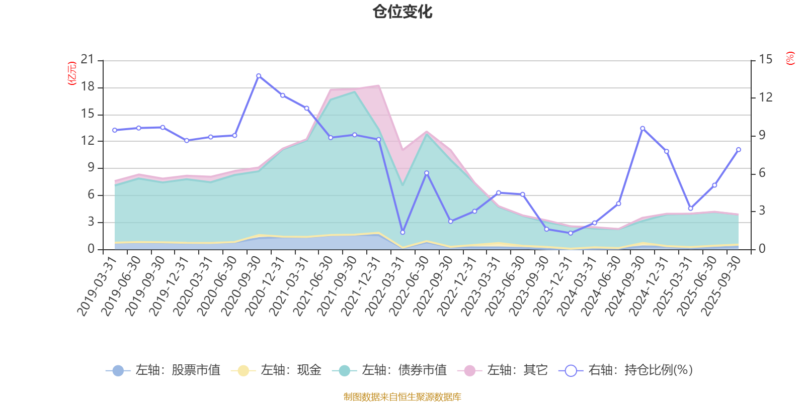 据定期报告数据统计,近三年平均股票仓位为4.52%,同类平均为72.35%。2020年三季度末基金达到13.77%的最高仓位,2023年末最低,为1.3%。