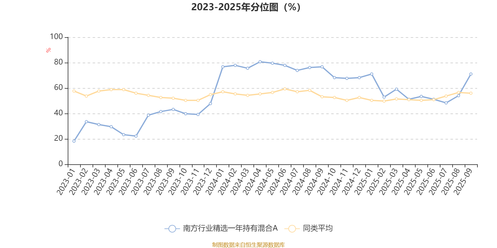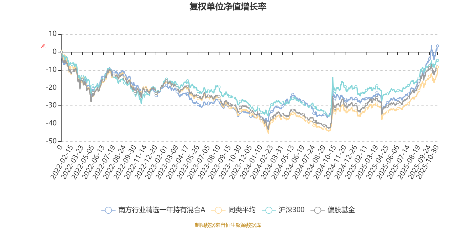 截至10月30日,南方行业精选一年持有混合A近三个月复权单位净值增长率为30.09%,位于同类可比基金22/185;近半年复权单位净值增长率为45.00%,位于同类可比基金34/185;近一年复权单位净值增长率为39.37%,位于同类可比基金56/181;近三年复权单位净值增长率为36.22%,位于同类可比基金53/175。