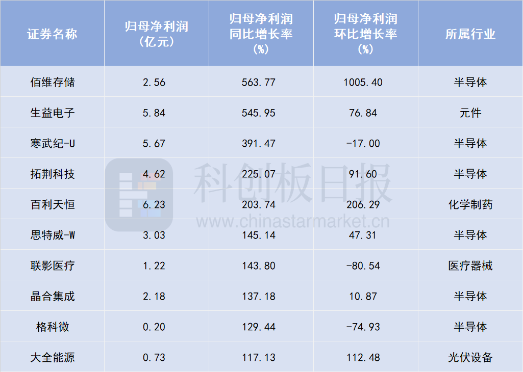 在Q3净利润同比增幅前十中,半导体行业公司占据了过半席位,包括佰维存储(存储芯片)、寒武纪(AI芯片)、拓荆科技(半导体设备)、思特威(CIS)、晶合集成(代工)、格科微(CIS);其余则为医药医疗、电子元件、光伏行业公司。