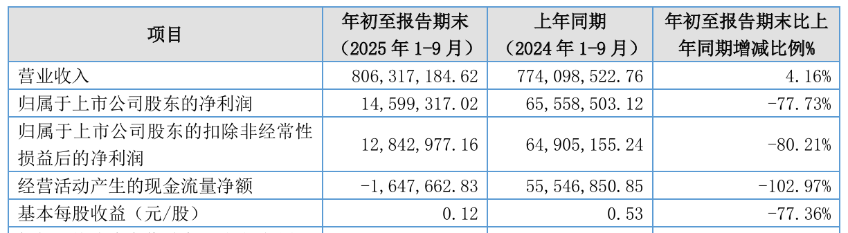 10月28日,康比特(920429)发布2025年三季报。报告显示,公司前三季度营业收入为8.06亿元,同比增长4.16%;归母净利润为1459.93万元,同比下降77.73%;扣非归母净利润为1284.30万元,同比下降80.21%。