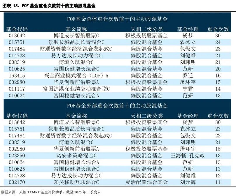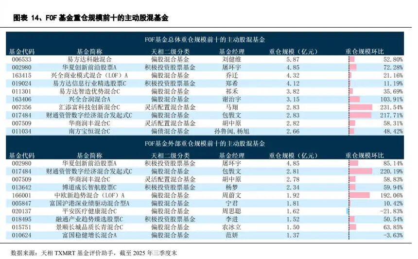 (注:FOF外部重仓是指除自己公司FOF持有自家旗下基金的情况以外,被外部公司旗下FOF持有的情况。下同)