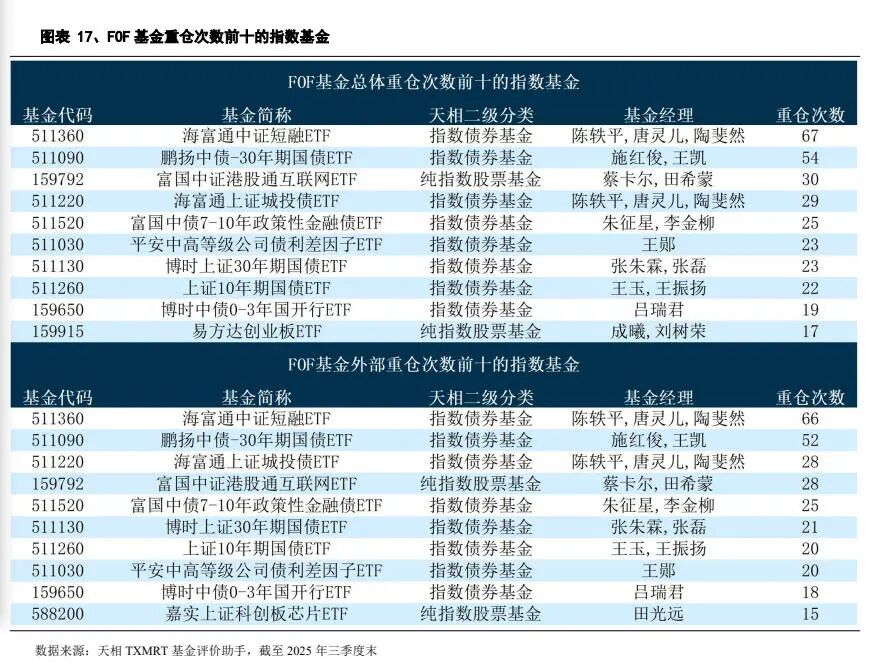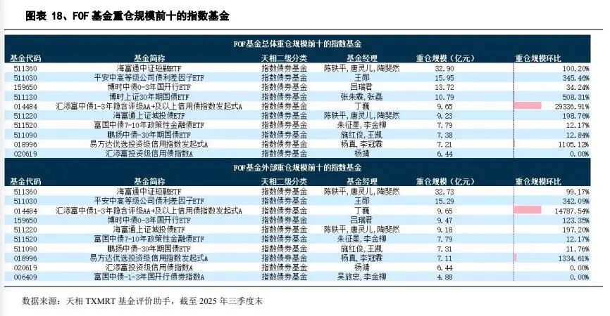 指数基金中,不分股债,截至三季度末,海富通中证短融ETF被FOF总体重仓次数最高,为67次;其次为鹏扬中债-30年期国债ETF,被重仓54次。FOF外部重仓次数前十的指数基金名单与总体重仓次数前十的基金名单具有一定的相似性。从重仓规模来看,截至三季度末,海富通中证短融ETF被FOF总体重仓规模最高,达32.90亿元,较上季度上升100.20%;其次为平安中高等级公司债利差因子ETF,被FOF总体重仓为15.95亿元,较上季度增长345.46%。