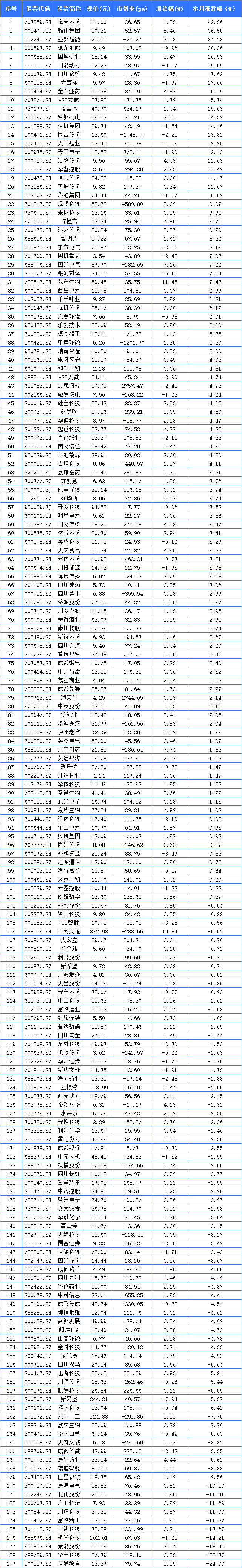 领涨的股票中,海天股份、雅化集团、盛新锂能分别以涨幅42.86%、36.58%和34.28%,列四川A股10月涨幅前三强。