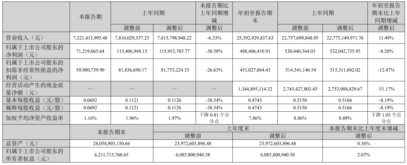 其中第三季度,公司营业收入为73.21亿元,同比下降6.33%;归母净利润为7122万元,同比下降38.58%;扣非归母净利润为5998万元,同比下降26.63%。