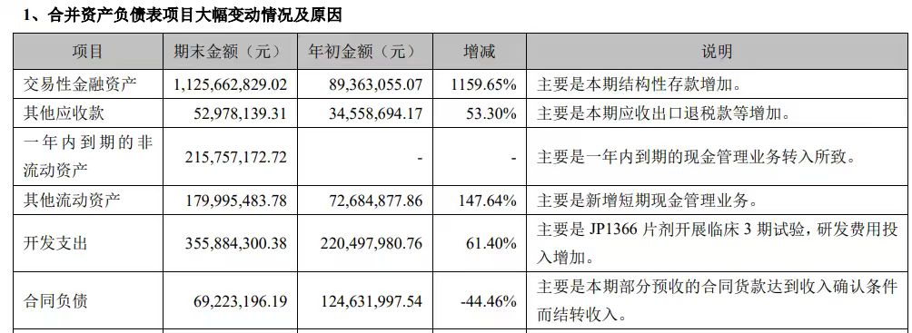 在三季报中,丽珠集团对公司部分财务指标发生变动的情况及原因作了说明。其中,公司开发支出增加61.40%,主要是 JP1366 片剂开展临床 3 期试验,研发费用投入增加所致;合同负债减少44.46%,主要是本期部分预收的合同货款达到收入确认条件而结转收入。