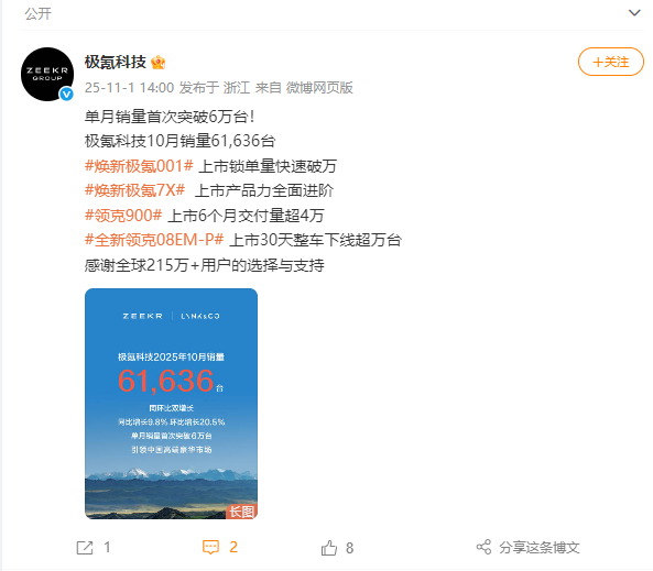 据极氪科技官方微博,10月极氪科技销量61636台,同比增长9.8%,环比增长20.5%,单月销量首次突破6万台。