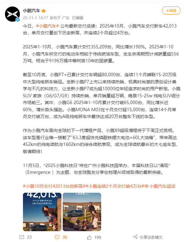 据小鹏汽车官方微博,2025年10月,小鹏汽车交付新车42013台,单月交付量创下历史新高,并连续2个月超过4万台。