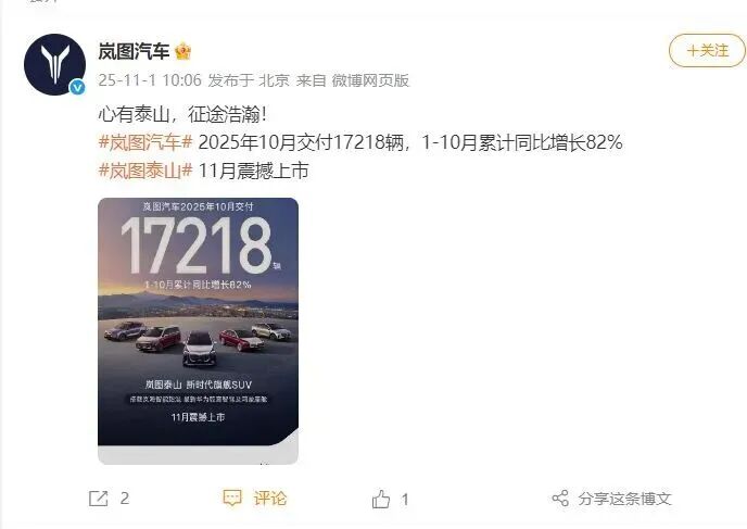 据岚图汽车官方微博,岚图汽车2025年10月交付17218辆,1—10月累计同比增长82%。