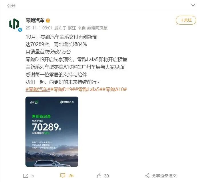 据零跑汽车官方微博,10月零跑汽车全系交付再创新高,达70289台,同比增长超84%。