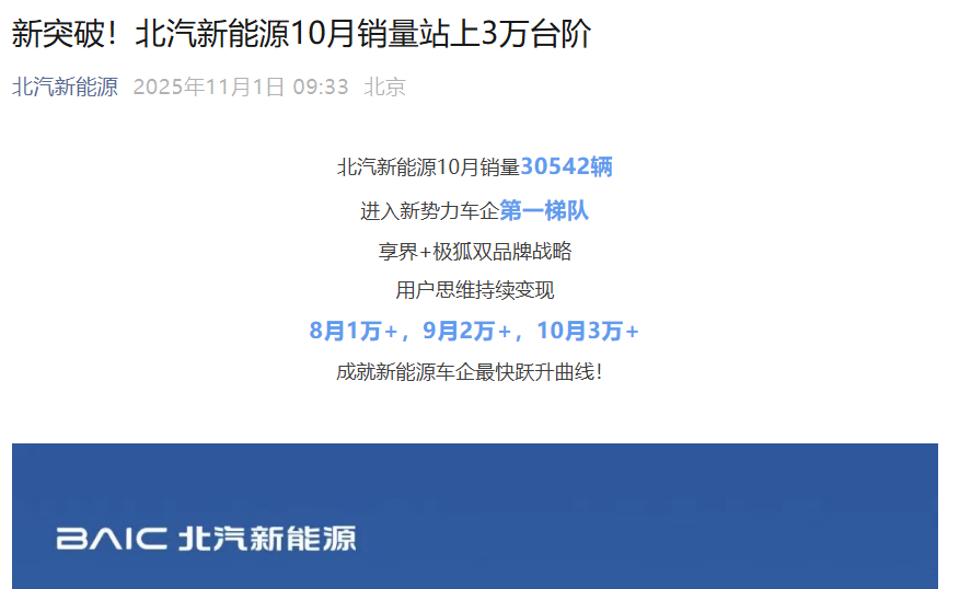 据北汽新能源官方公众号,北汽新能源10月销量站上3万台阶,具体为30542辆,进入新势力车企第一梯队,同比增长112%,环比增长48.7%。1—10月北汽新能源销量累计142043辆,同比增长73%。