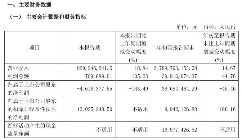 其中第三季度,公司营业收入为9.29亿元,同比下降18.8%;归母净利润盈转亏损462万元,同比下降143.5%;扣非归母净利润自去年同期亏损336万元变为亏损1303万元,亏损额进一步扩大;EPS为-0.0057元。