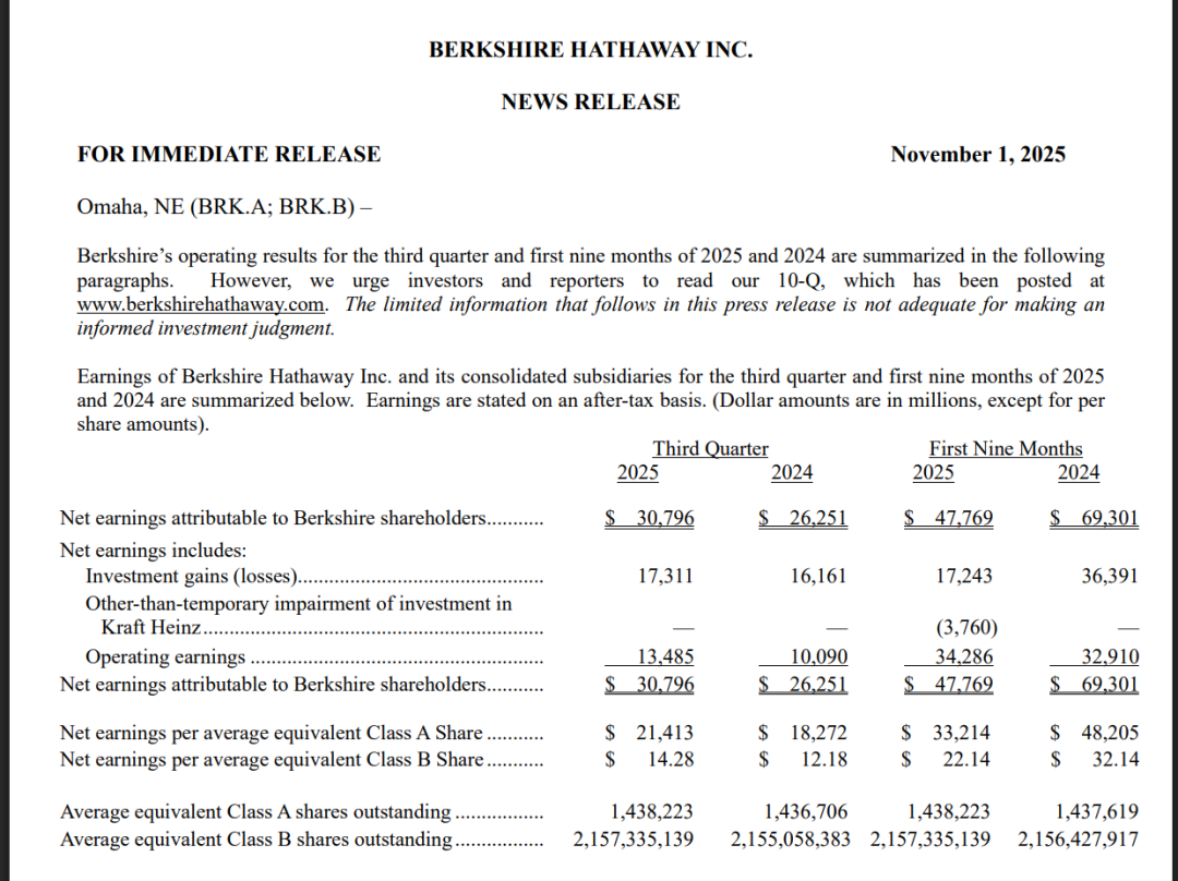 大家好,一起来关注一下股神巴菲特旗下公司——伯克希尔哈撒韦发布的最新财报。