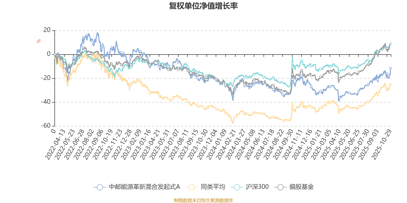 截至10月29日,中邮能源革新混合发起式A近三个月复权单位净值增长率为17.34%,位于同类可比基金63/100;近半年复权单位净值增长率为34.68%,位于同类可比基金53/99;近一年复权单位净值增长率为12.60%,位于同类可比基金80/90;近三年复权单位净值增长率为-13.96%,位于同类可比基金46/62。