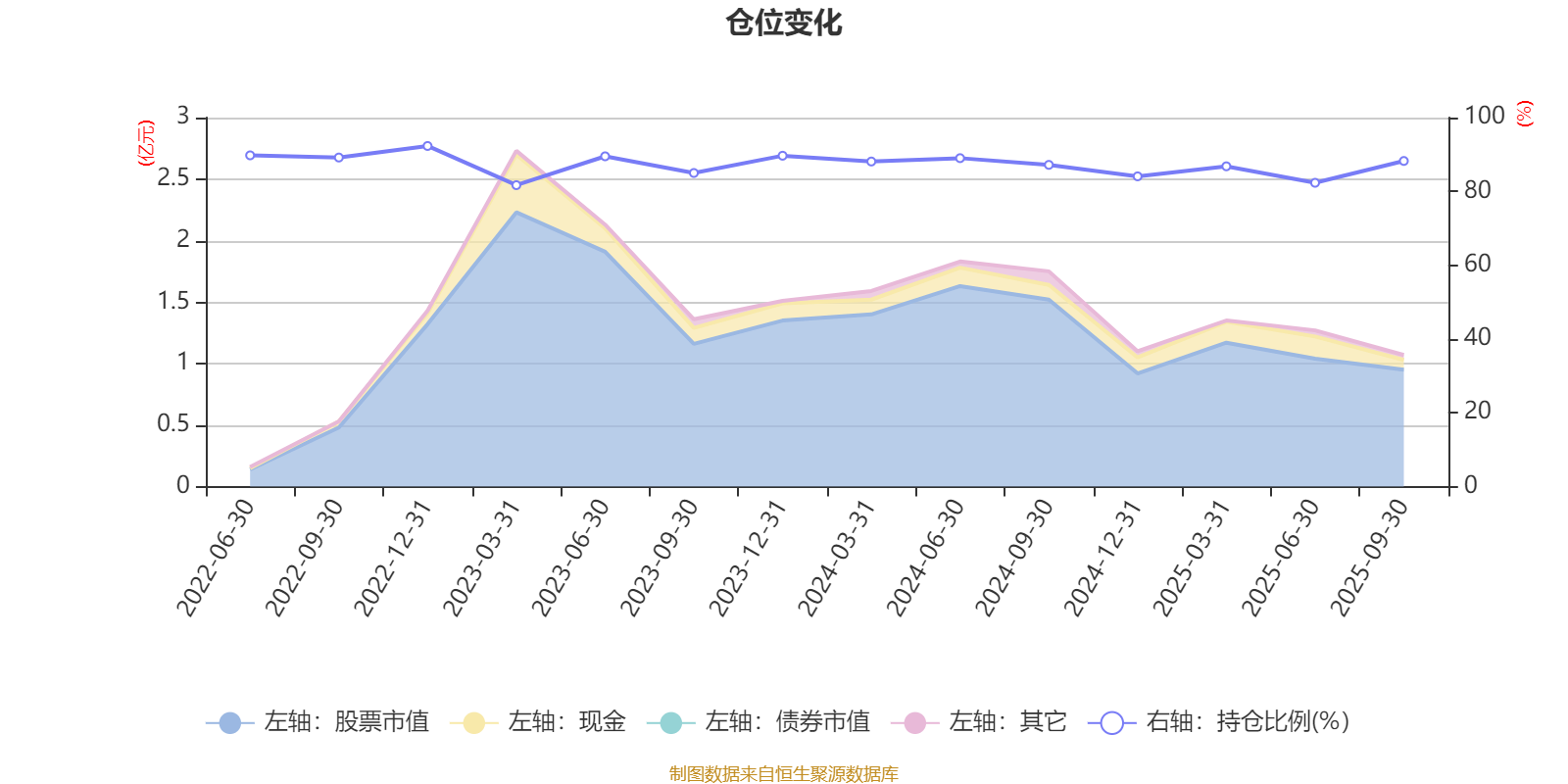 据定期报告数据统计,近三年平均股票仓位为86.99%,同类平均为87.09%。2022年末基金达到92.31%的最高仓位,2023年一季度末最低,为81.69%。