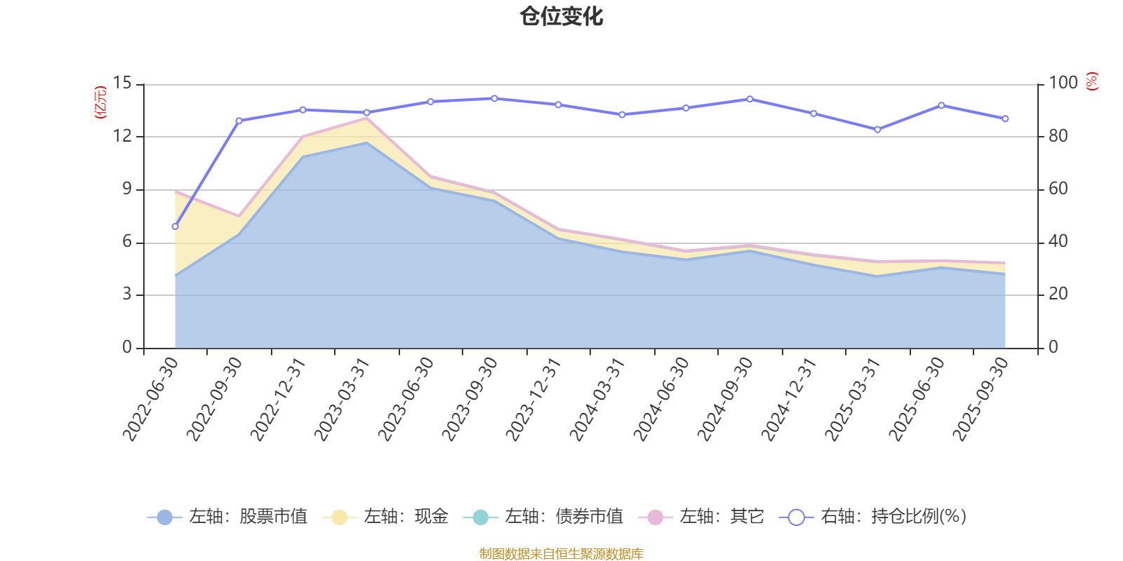 据定期报告数据统计,近三年平均股票仓位为90.34%,同类平均为86.57%。2023年三季度末基金达到94.59%的最高仓位,2022年上半年末最低,为46.11%。