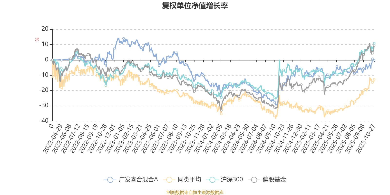 截至10月27日,广发睿合混合A近三个月复权单位净值增长率为3.72%,位于同类可比基金46/49;近半年复权单位净值增长率为13.38%,位于同类可比基金45/49;近一年复权单位净值增长率为19.08%,位于同类可比基金38/42;近三年复权单位净值增长率为0.78%,位于同类可比基金23/29。