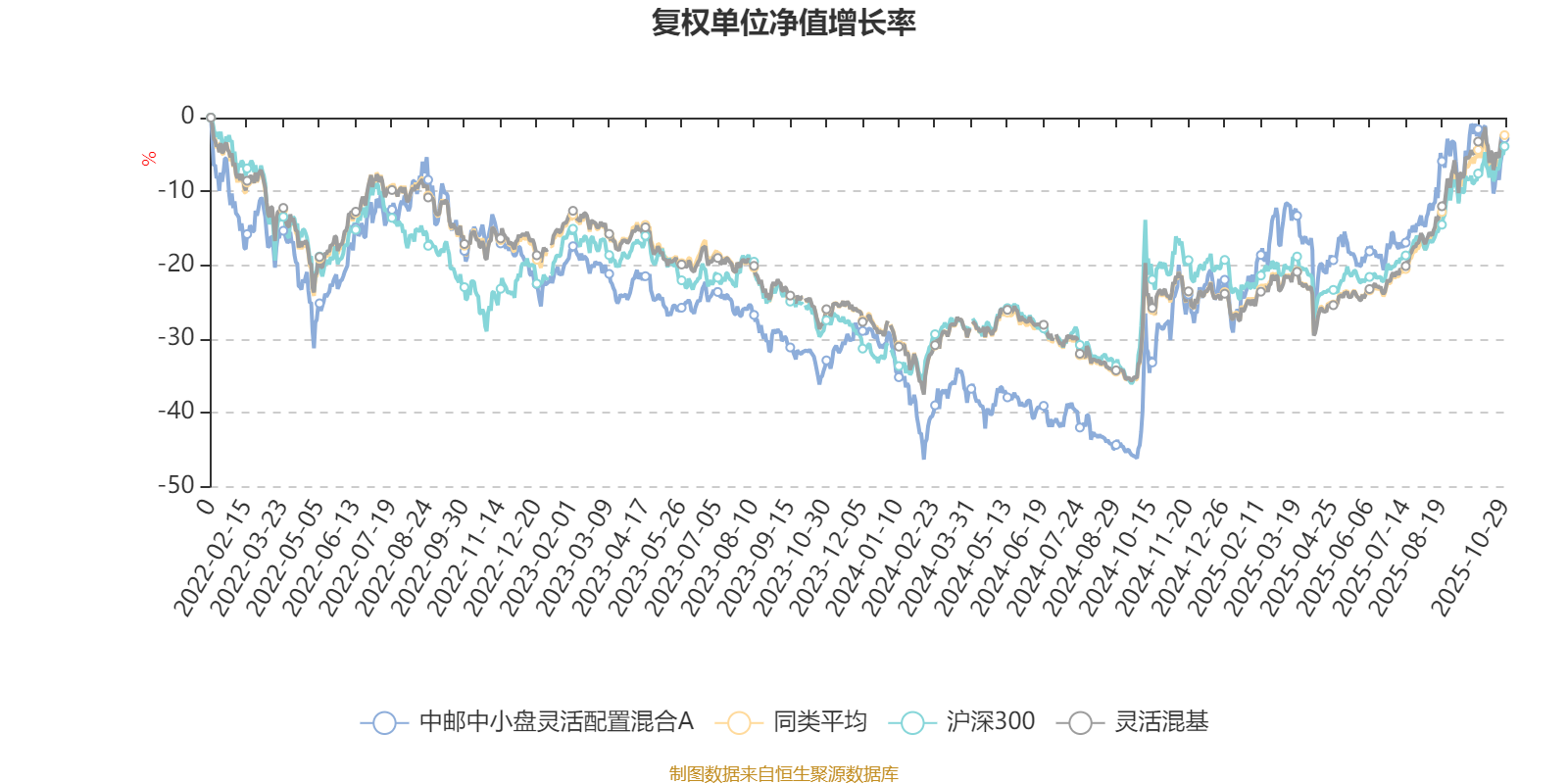 截至10月29日,中邮中小盘灵活配置混合A近三个月复权单位净值增长率为12.06%,位于同类可比基金656/1287;近半年复权单位净值增长率为19.96%,位于同类可比基金791/1287;近一年复权单位净值增长率为34.80%,位于同类可比基金388/1287;近三年复权单位净值增长率为17.32%,位于同类可比基金645/1286。