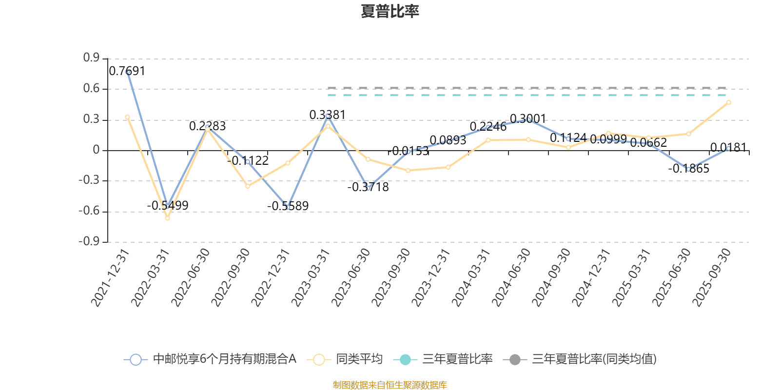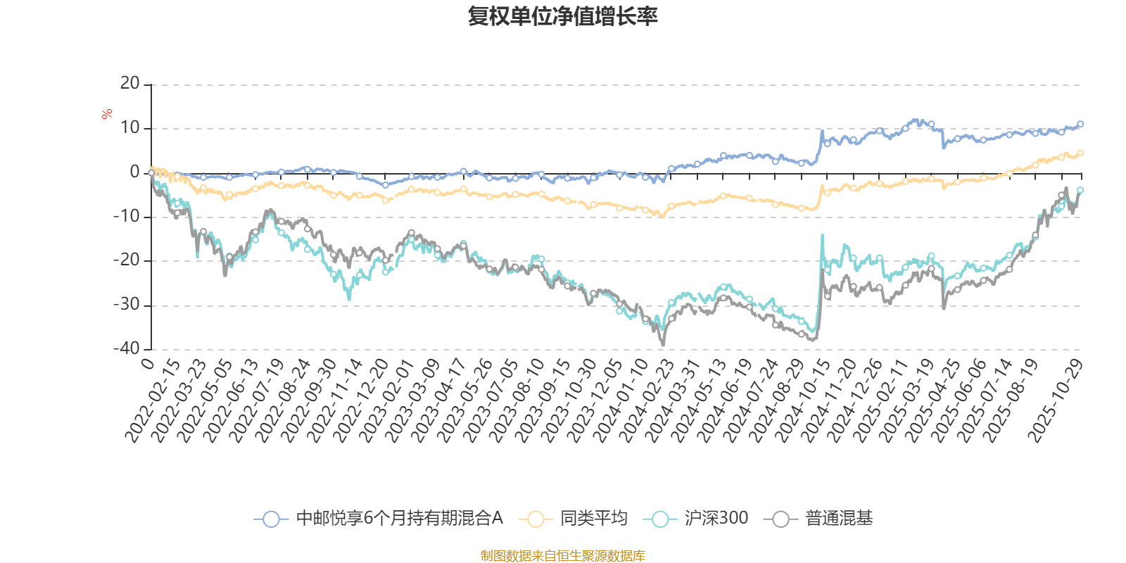 截至10月29日,中邮悦享6个月持有期混合A近三个月复权单位净值增长率为2.10%,位于同类可比基金375/629;近半年复权单位净值增长率为3.29%,位于同类可比基金492/629;近一年复权单位净值增长率为3.79%,位于同类可比基金545/623;近三年复权单位净值增长率为10.89%,位于同类可比基金331/557。
