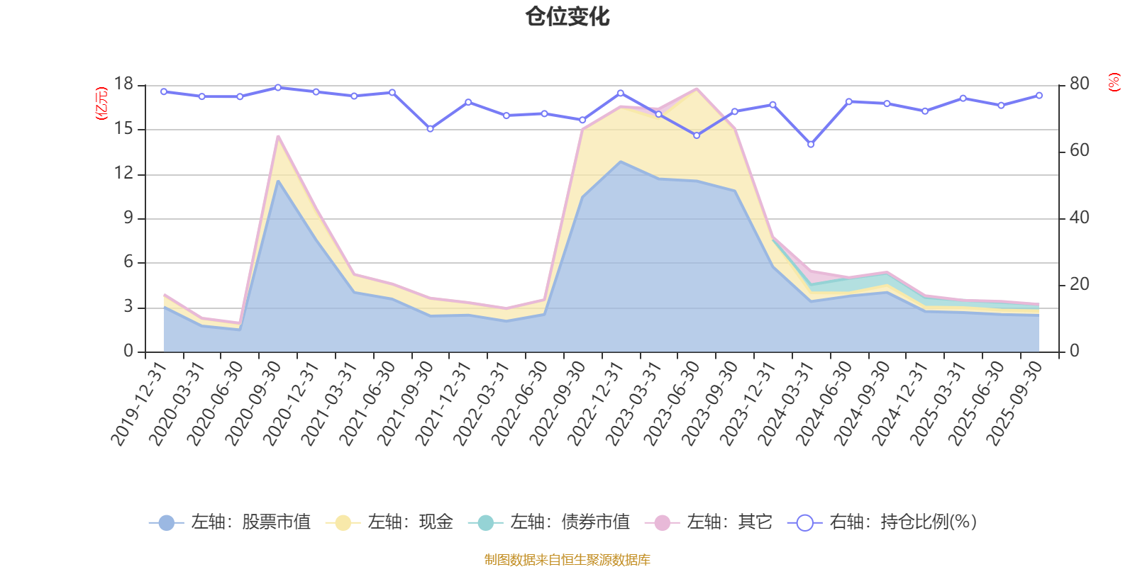 据定期报告数据统计,近三年平均股票仓位为72.56%,同类平均为67.37%。2020年三季度末基金达到79.26%的最高仓位,2024年一季度末最低,为62.23%。