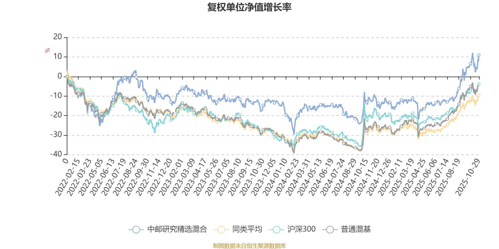 截至10月29日,中邮研究精选混合近三个月复权单位净值增长率为24.32%,位于同类可比基金18/134;近半年复权单位净值增长率为32.07%,位于同类可比基金33/134;近一年复权单位净值增长率为27.11%,位于同类可比基金49/130;近三年复权单位净值增长率为28.29%,位于同类可比基金42/119。