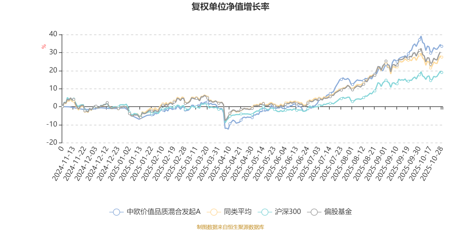 截至10月28日,中欧价值品质混合发起A近三个月复权单位净值增长率为15.91%,位于同类可比基金273/689;近半年复权单位净值增长率为41.80%,位于同类可比基金137/688。