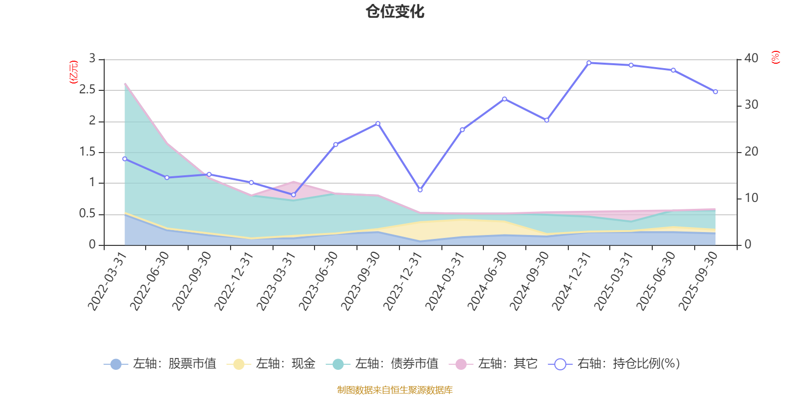 据定期报告数据统计,近三年平均股票仓位为26.32%,同类平均为19.14%。2024年末基金达到39.23%的最高仓位,2023年一季度末最低,为10.84%。