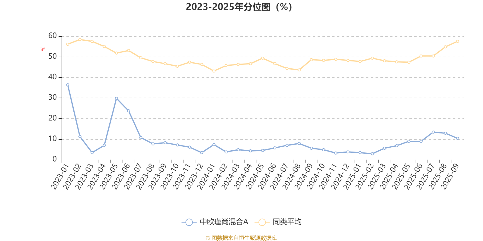 通过所选区间该基金净值增长率分位图,可以观察该基金与同类基金业绩比较情况。图为坐标原点到区间内某时点的净值增长率在同类基金中的分位数。