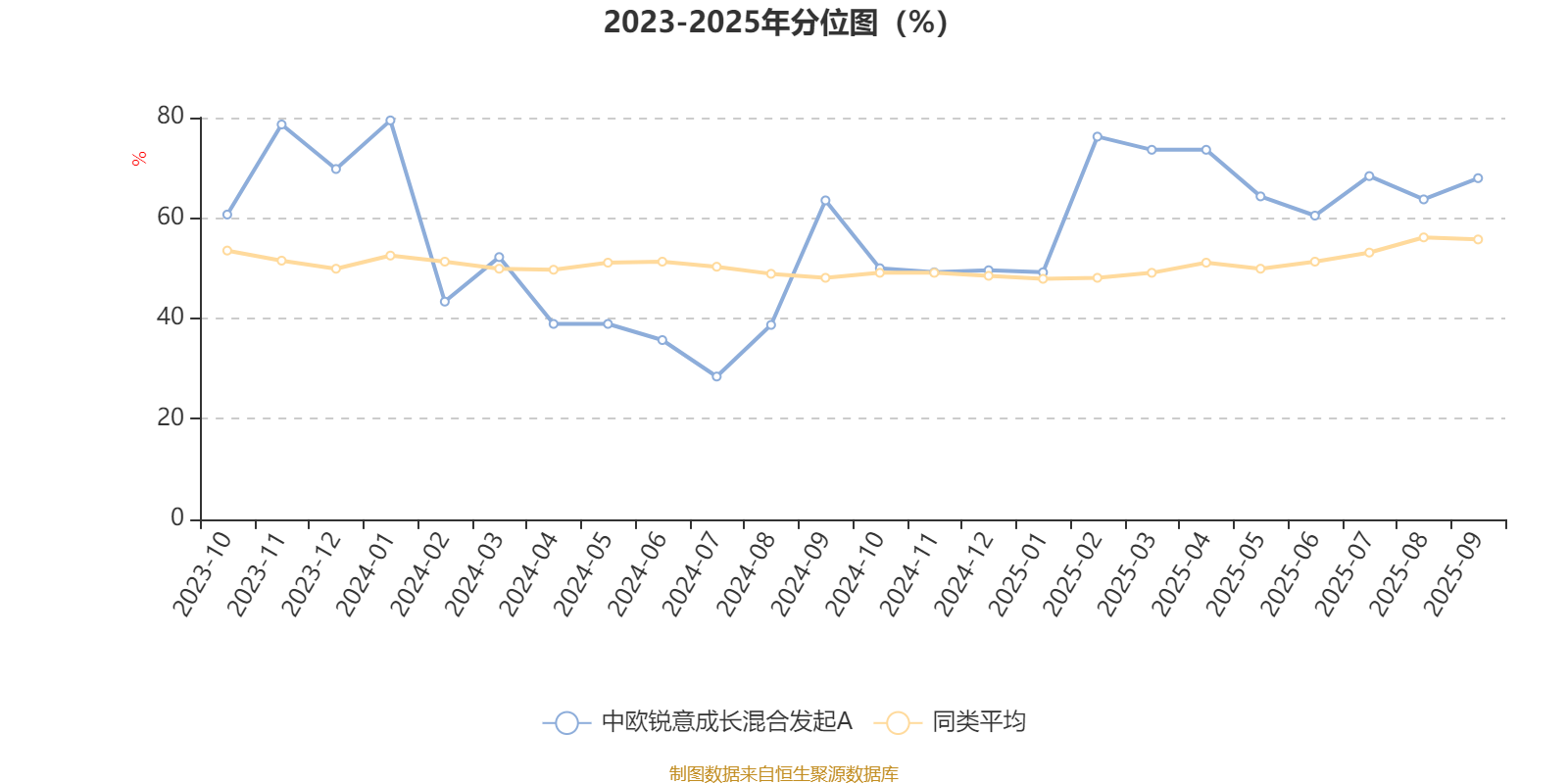通过所选区间该基金净值增长率分位图,可以观察该基金与同类基金业绩比较情况。图为坐标原点到区间内某时点的净值增长率在同类基金中的分位数。