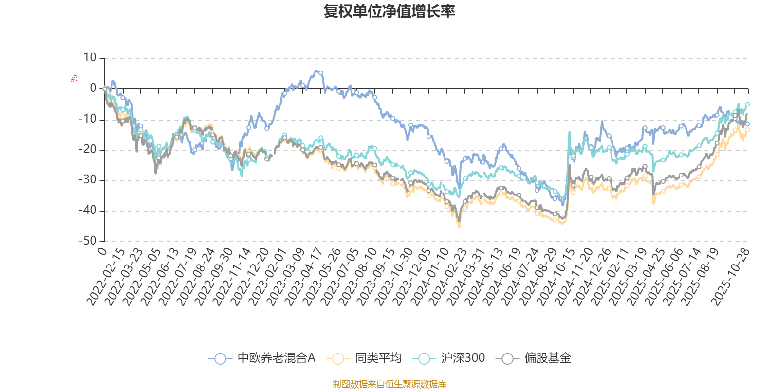 截至10月28日,中欧养老混合A近三个月复权单位净值增长率为-2.54%,位于同类可比基金184/185;近半年复权单位净值增长率为3.59%,位于同类可比基金185/185;近一年复权单位净值增长率为7.77%,位于同类可比基金167/181;近三年复权单位净值增长率为8.69%,位于同类可比基金128/175。