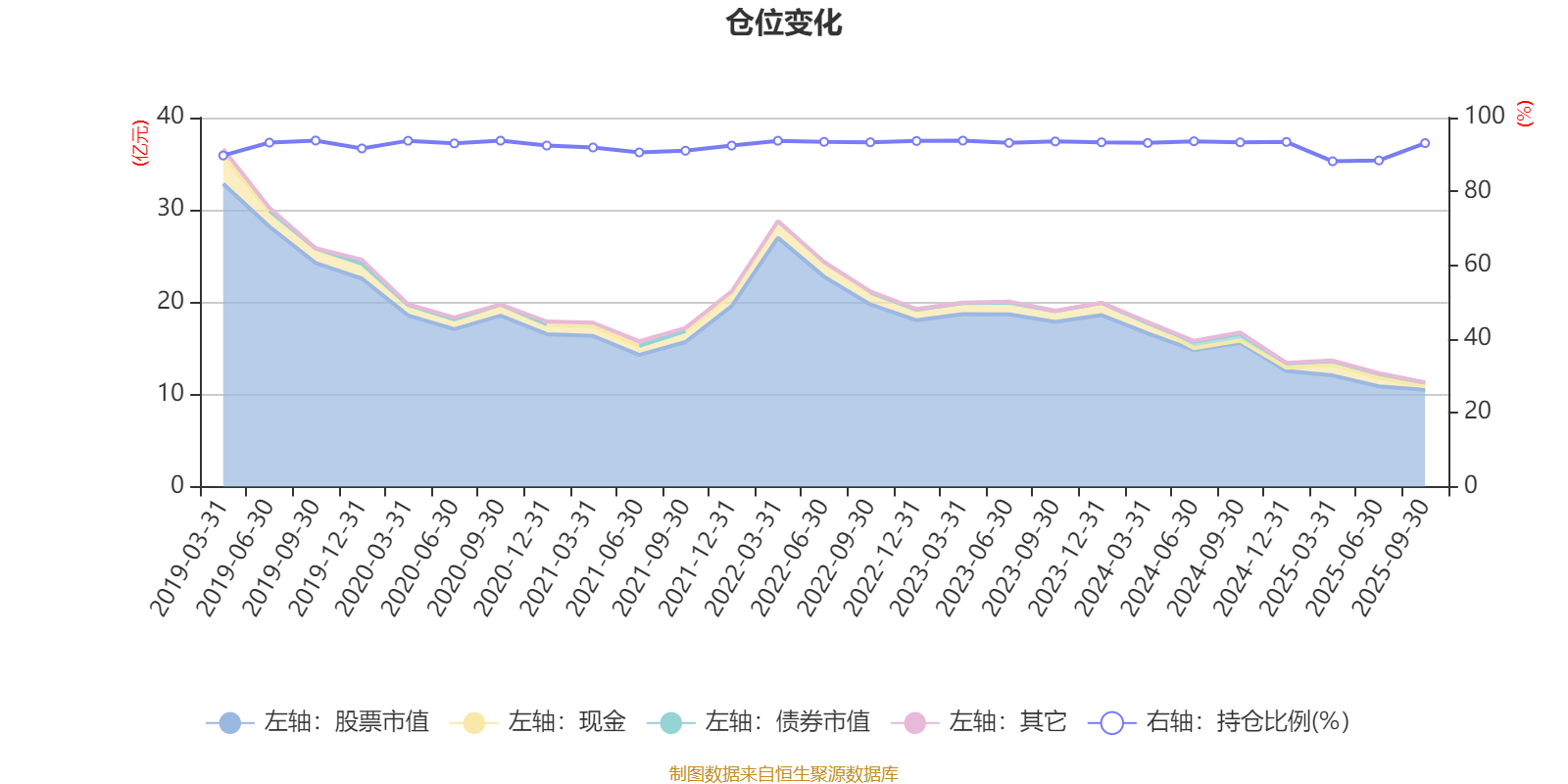 据定期报告数据统计,近三年平均股票仓位为92.54%,同类平均为72.35%。2019年三季度末基金达到93.78%的最高仓位,2025年一季度末最低,为88.16%。
