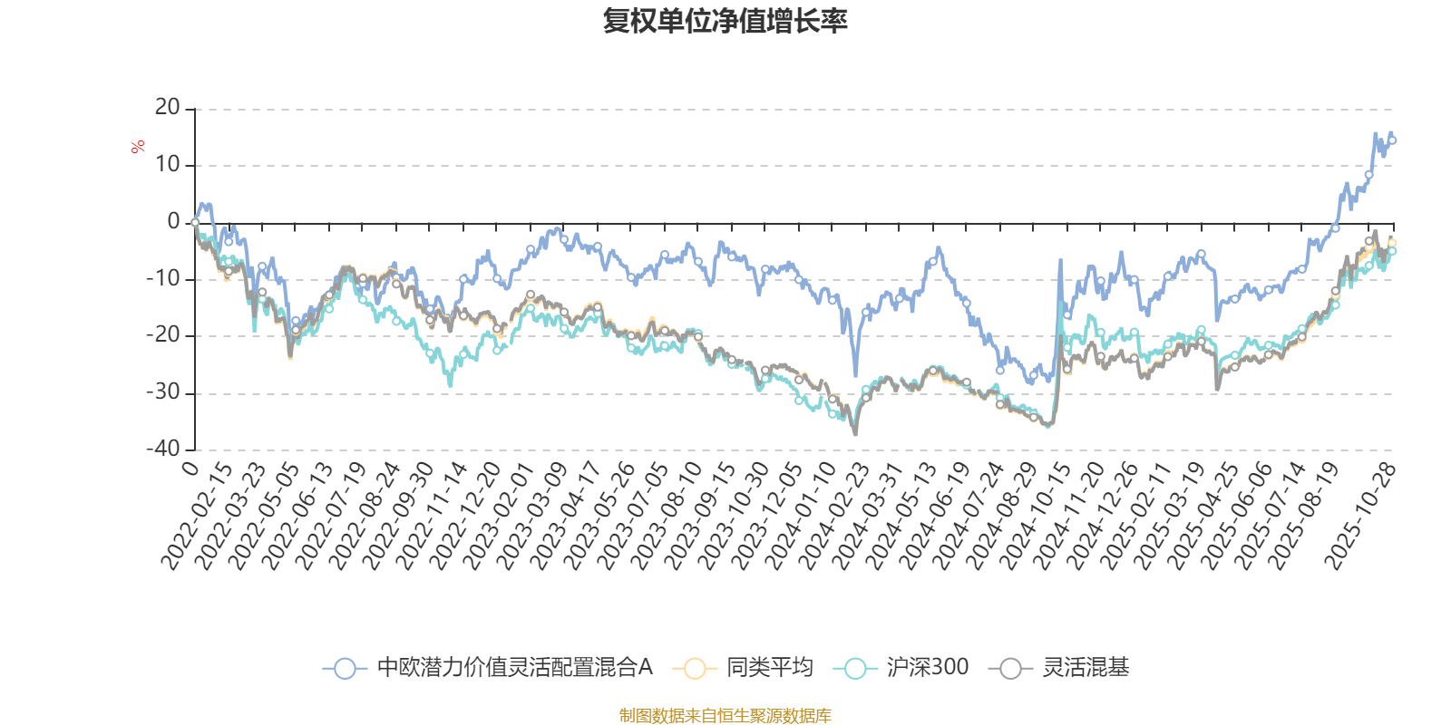 截至10月28日,中欧潜力价值灵活配置混合A近三个月复权单位净值增长率为18.50%,位于同类可比基金401/1287;近半年复权单位净值增长率为32.62%,位于同类可比基金424/1287;近一年复权单位净值增长率为27.39%,位于同类可比基金484/1287;近三年复权单位净值增长率为39.88%,位于同类可比基金244/1286。