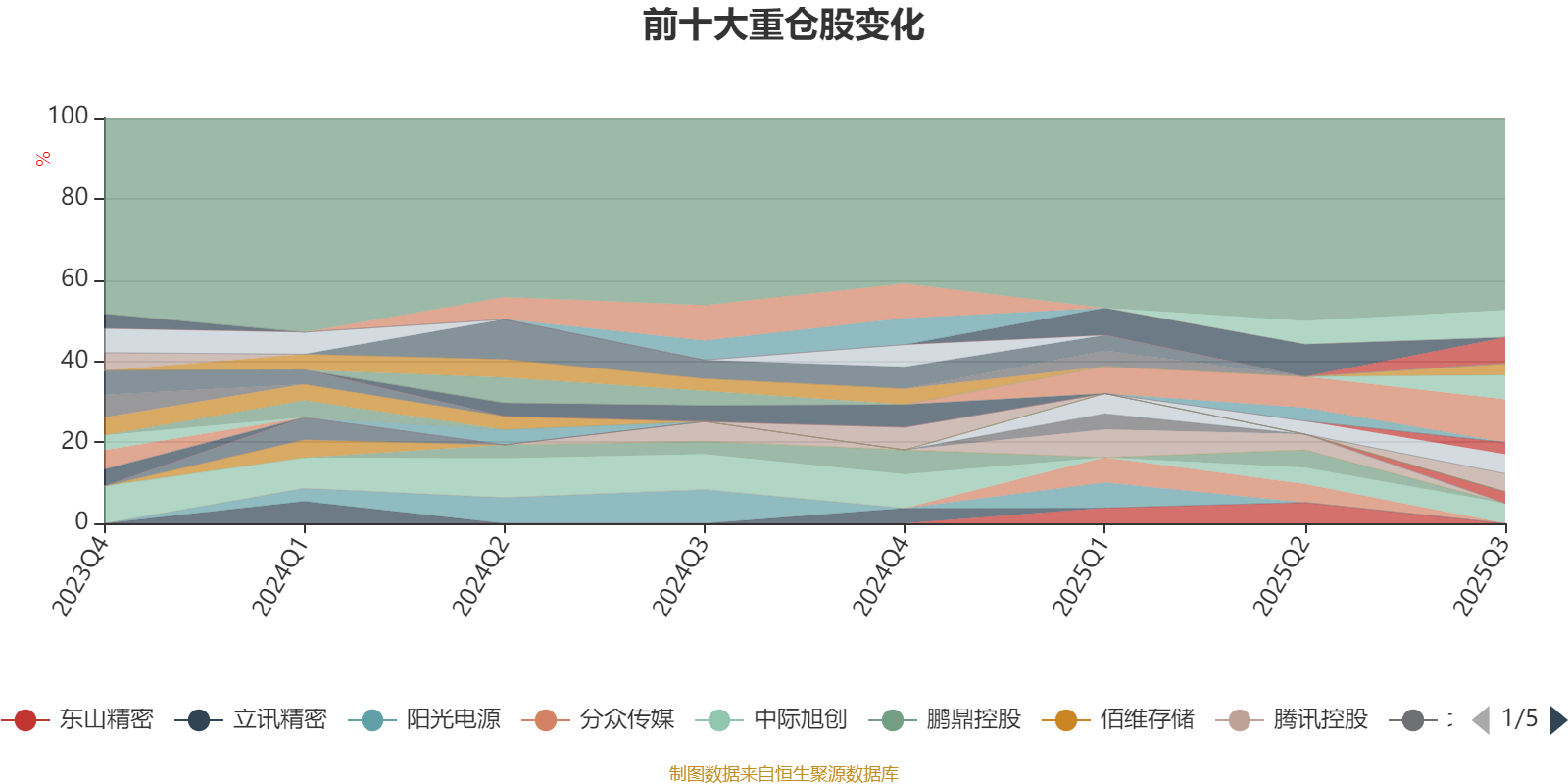 截至2025年三季度末,基金十大重仓股分别是中芯国际、蓝思科技、华虹半导体、歌尔股份、中际旭创、澜起科技、寒武纪、同花顺、中天科技、科达利。